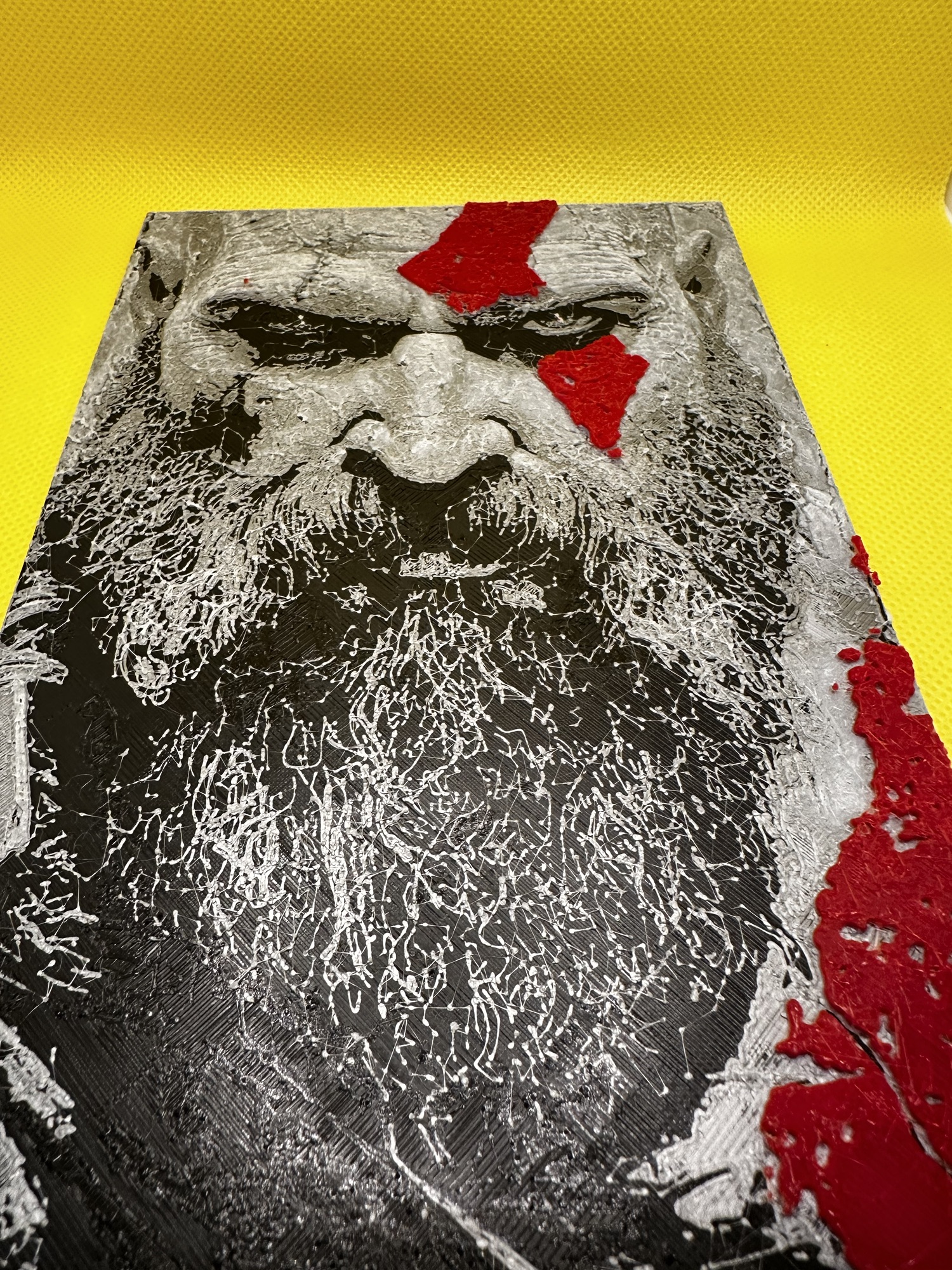 This poster is approximately 13cmx20cm and comes in a beautiful color pop style 3d filament painting of 2.2 mm depth. The beautiful red tattoos of Kratos pop out with a black/silver/white background.